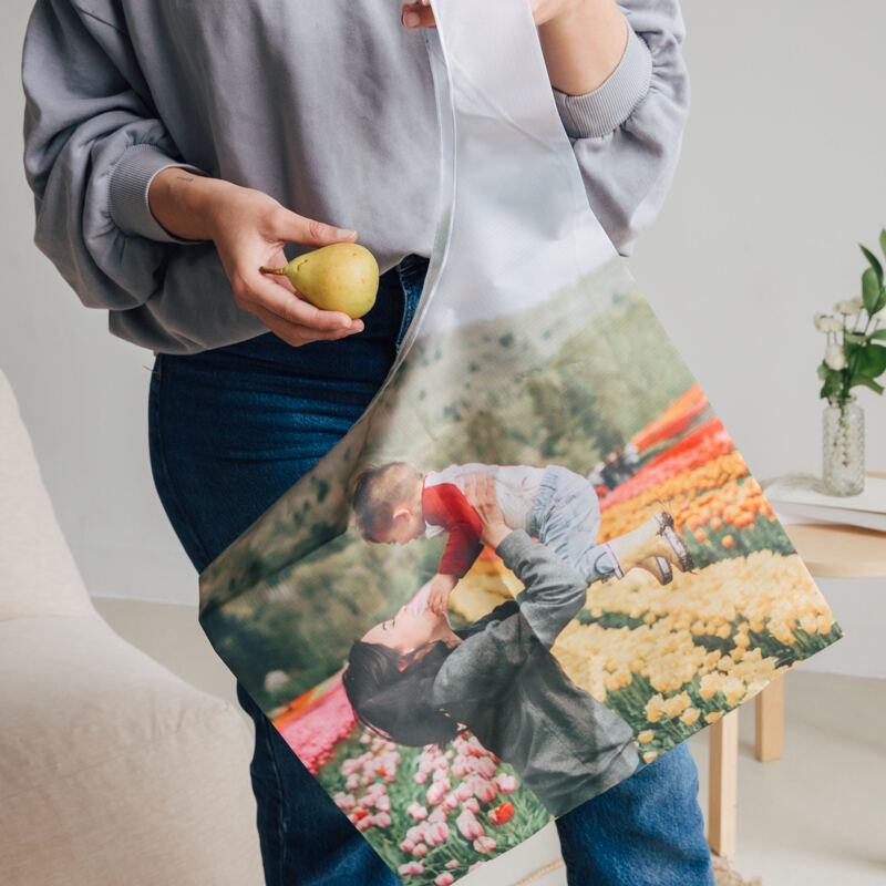 ポップな色柄や思い出の写真をプリントして、毎週の買い物や旅行に彩りをプラスしましょう。フロントとバックの2面にデザインできるため、片面に家族写真、もう片面にペットのイラストを配置するなど自由自在。1枚布で縫製されているので耐久性が高く、中身が落ちにくい構造です。軽量で防水性に優れており、プールやビーチ、ジム用としても活躍。幅広ストラップが荷重を分散し、最大20kgまでしっかり運べます。トート バッグ オリジナルとして、日常使いから旅行のお供まで幅広く活躍する一枚です。さらにトート バッグ 印刷に用いられる高品質プリント技術で、発色も長持ちします。