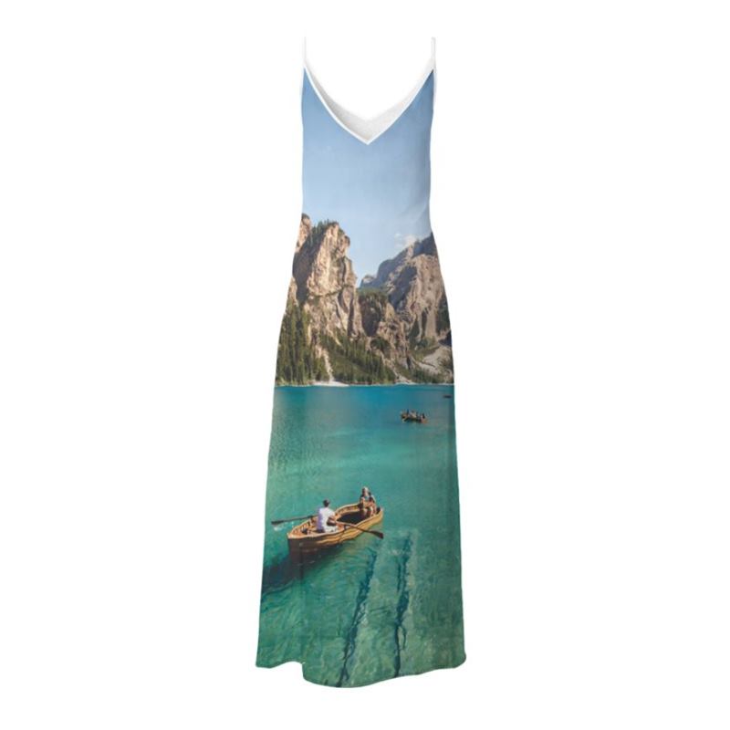 下に流れるフレアと絞ったウエストが特徴のこの『オリジナル キャミ ワンピース』は、旅の写真やグラフィックアートを大胆に配置するのがおすすめ。アートピースのような一枚が完成します。