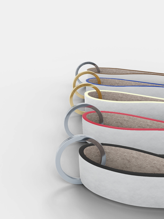 次に、革を裁断し、エッジを複数のレイヤーペイントで(選択された色で)塗装し、美しく大胆な仕上げにします。 レッドとブルーの大胆な色合いから、ブラックやクリームなどのニュートラルまで、5つの色から選択できます。 選ばれた色はループのどちらかのサイドに表現され、デザインと対照的な楽しいポップカラーをお選びいただいたり、同系色などお好きなようにアレンジできます。