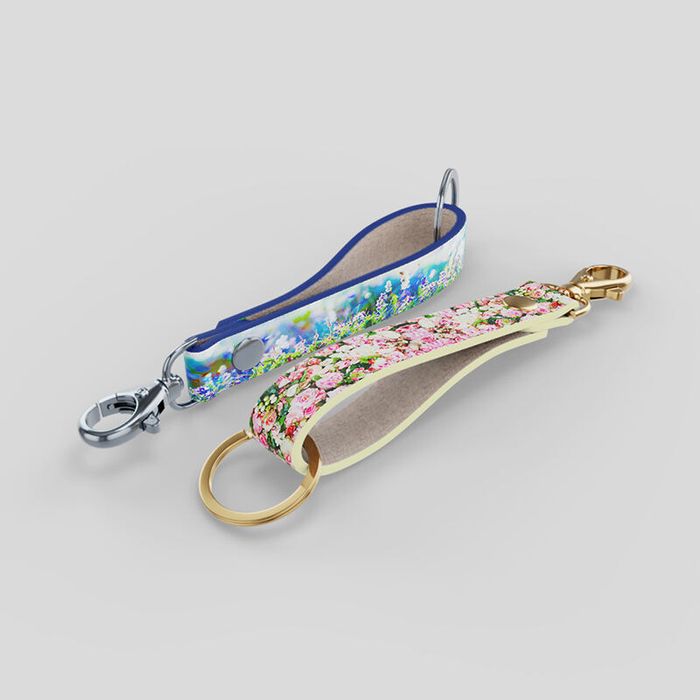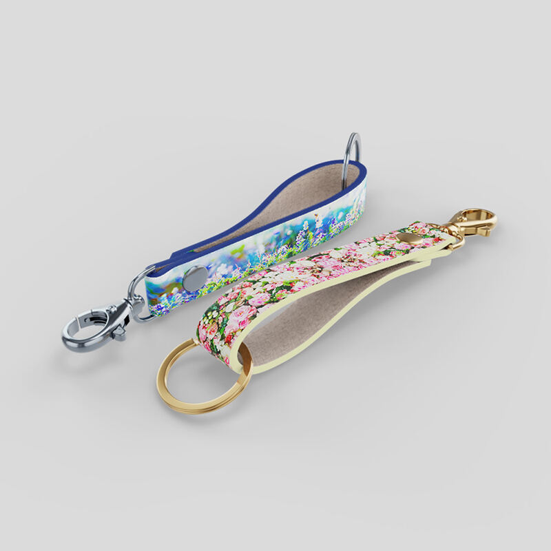 デザインに合わせてゴールドまたはシルバーのメタル金具を選択し、キーホルダーストラップが完成します。あらかじめ両方の金属色でデザインがどのように見えるかイメージを確認できますので、ご安心ください。