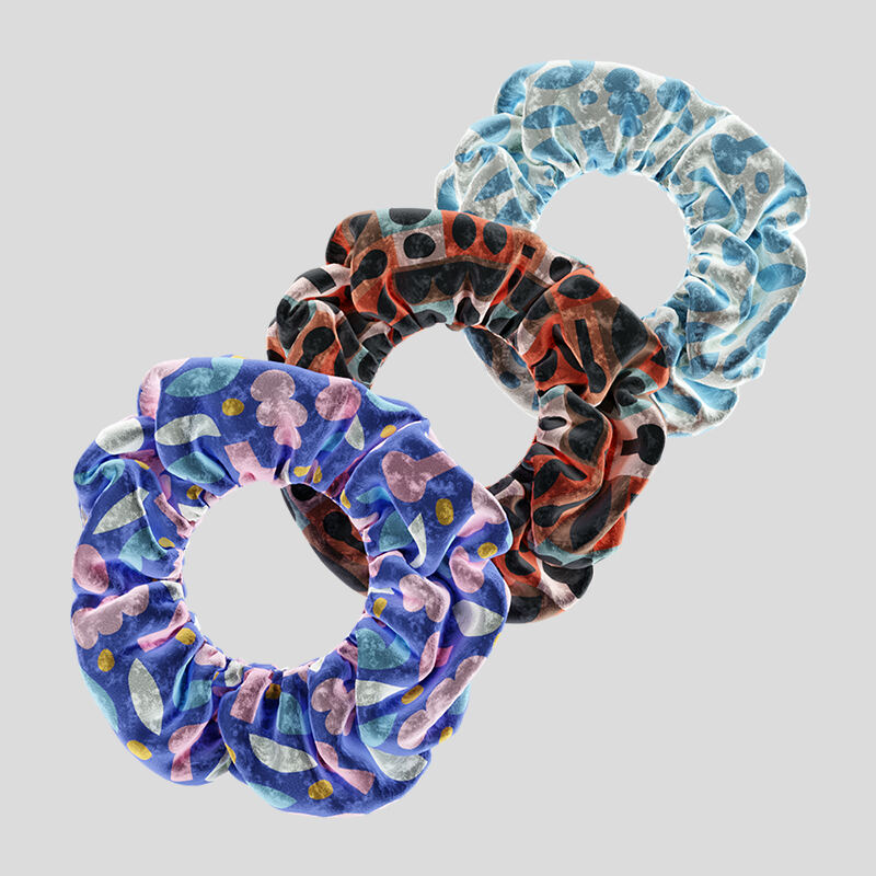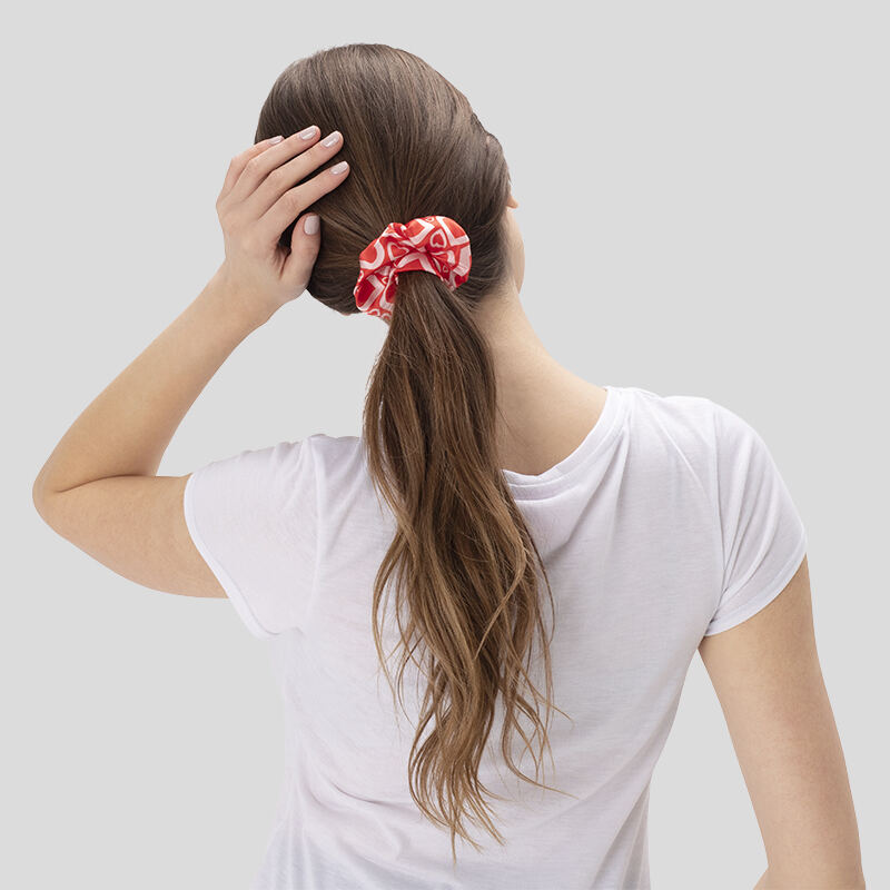 ドーナツ状にギャザーが寄るため、写真よりも総柄やロゴ、タイポグラフィが映えます。背景を単色にしてロゴのみを際立たせると、オリジナル シュシュ 制作がスタイリッシュに仕上がります。3つとも色違いで作ればリンクコーデに、同柄で作れば統一感が出てイベントにも◎。
