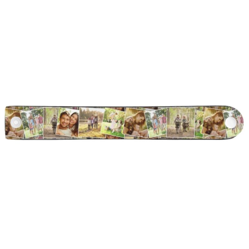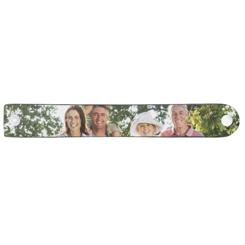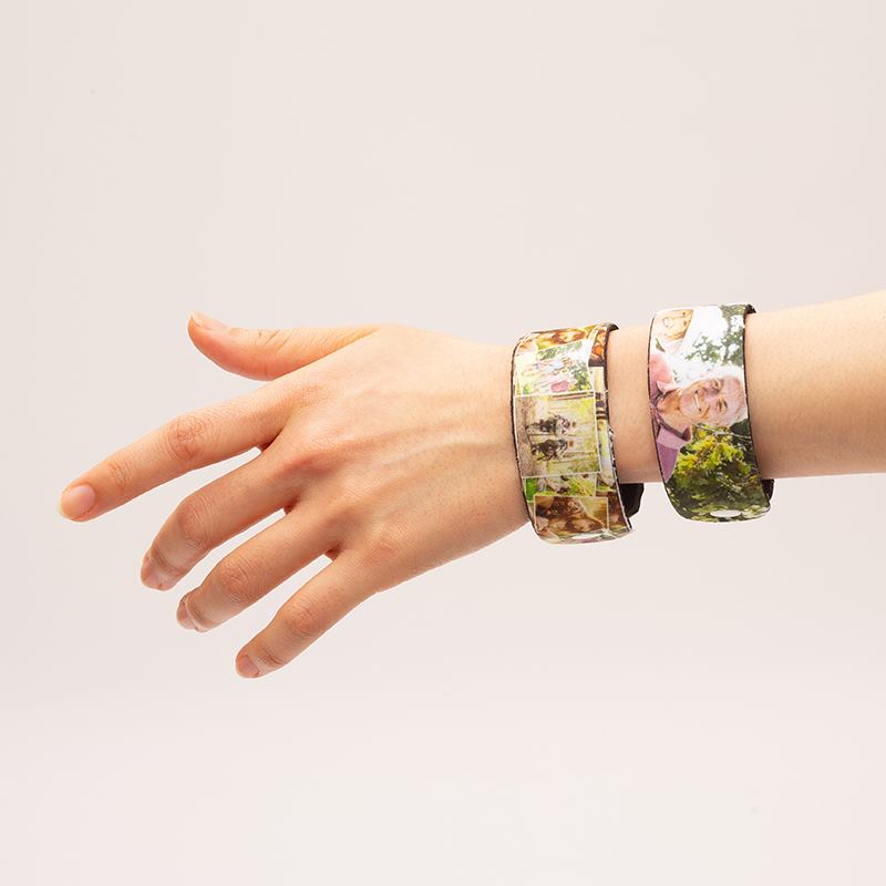 リストバンドのデザインは横長レイアウトが鍵。21.5×2.8cmの範囲内で写真や文字を配置し、重要なモチーフがスナップボタンにかからないようにしましょう。同じパターンをリピートすると継ぎ目が目立たず美しく仕上がります。