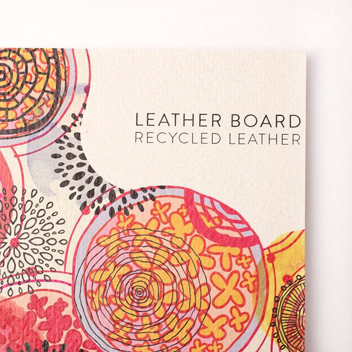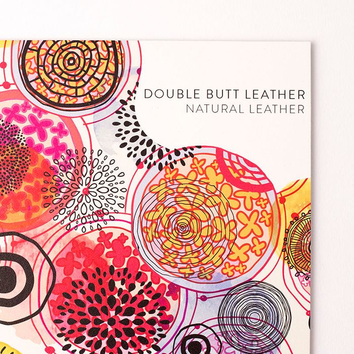 サンプルは A5 または A6 サイズ。本注文と同じプリント工程で革の繊維奥深くにインクを浸透させるため、発色が鮮やかで剥がれにくいのが特長です。