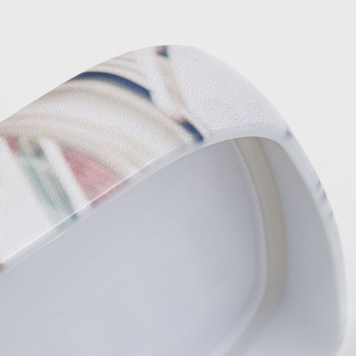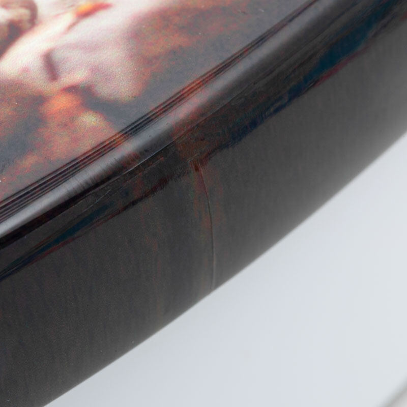 自社工房で専門の印刷技術者がフタの曲面に沿ってプリントを施し、こすっても剥がれにくい光沢仕上げに。写真やデザインがフタ側面まで巻き付くことで立体的なビジュアルが完成します。