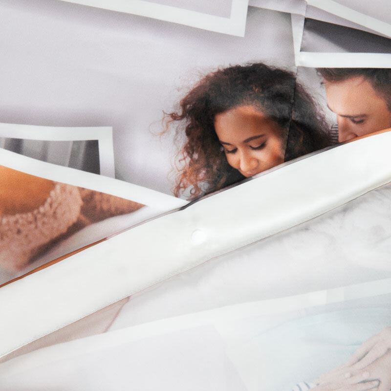 当社は最高級の素材のみを使用していますが、このシルクサテン生地も例外ではありません。光沢のある表面、高級感のあるハンドル、美しいドレープが特徴で、ベッドの上に広げても違和感がありません。反応性インクを使ってプリントされているので、鮮やかな色と深い黒が表現され、選んだ写真がとても映えます。画像をアップロードするだけで、プリント、縫製、梱包まですべて自社工房で手作業で行います。掛け布団の開口部には、簡単に使えるプレススタッドが付いているので、シーツの交換も簡単です。制作後は迅速発送でお届けします。