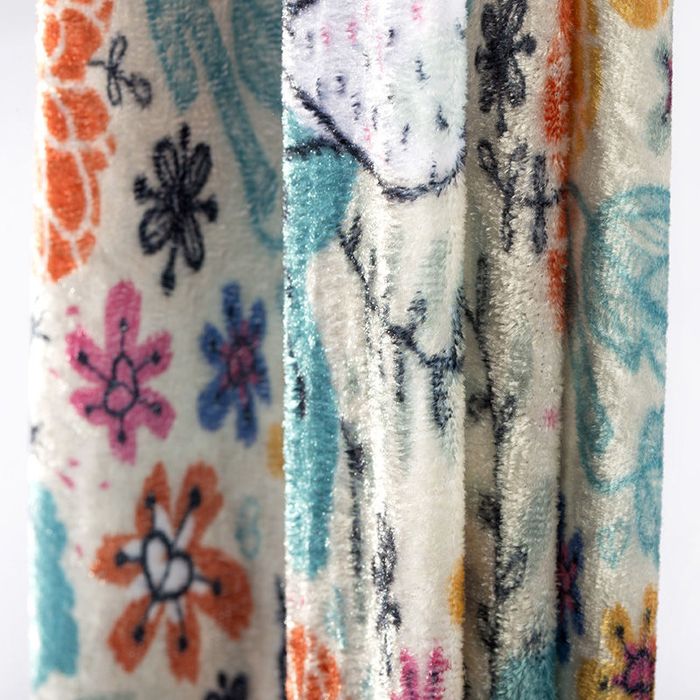 中くらいの重さで柔らかく、伸縮性あり。表面はブラシ加工済み。防炎で不透明。マット調でフワフワした生地。
