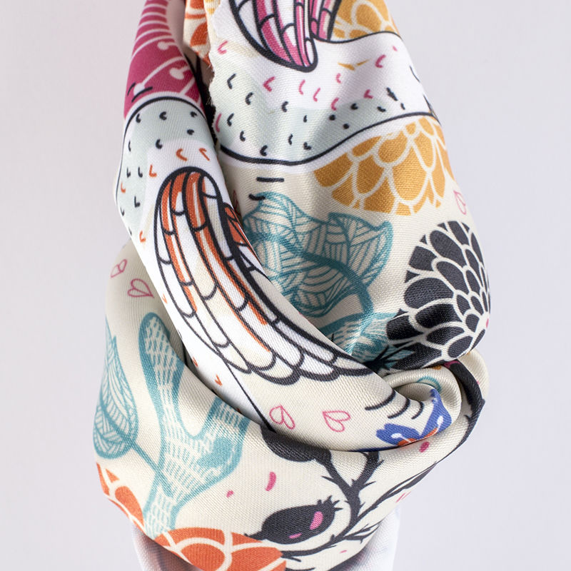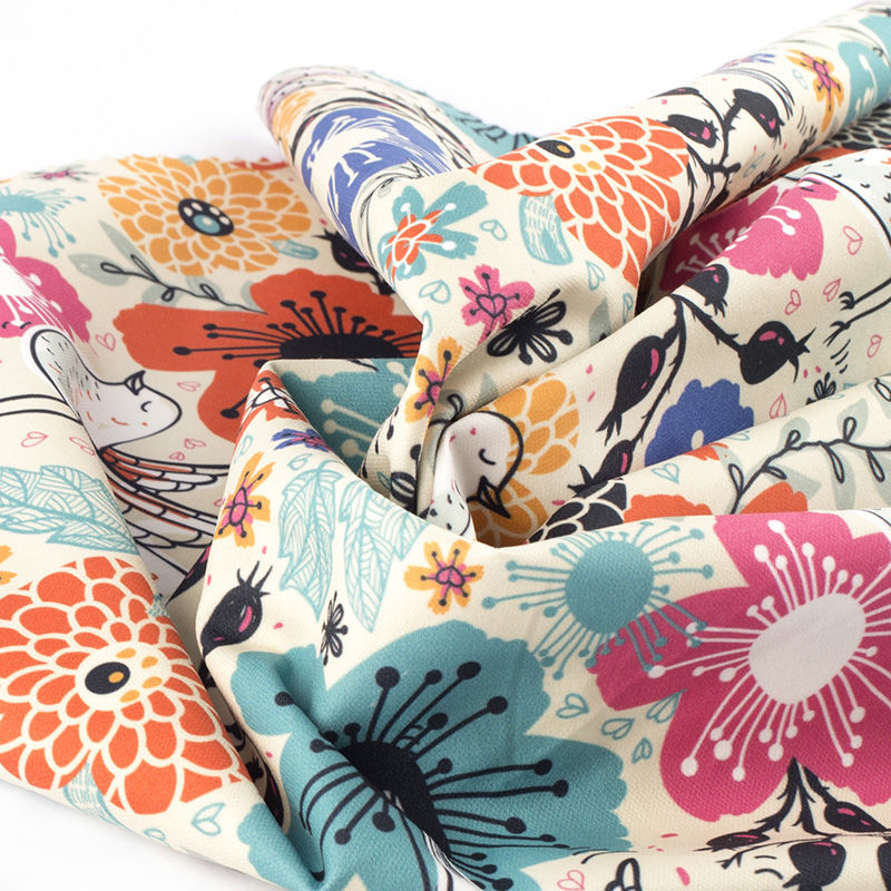 人体と環境に十分配慮した結果、高品質な水性のインクにたどり着きました。化学薬品や溶解剤は一切含まれていません。ただ水性といっても水で簡単に落ちてしまうわけではありません。むしろ洗濯も可能な布プリントなのです。気温や湿度に左右されないようプリントを安定させると同時に、印刷の際に出る汚れた蒸気や汚染水にまで考えられた、ハイテクでエコなプリントプロセスを採用しています。布生地をロール状にしたり筒缶に入れて配送梱包するのではなく、畳んだ状態でお送りします。こうすることにより週あたり150本のチューブ缶の節約、そして配送トラックの中で大きなスペースを取らずに済ませることが出来ます。デリケートな素材については布に合わせた最適な梱包でお送りします。