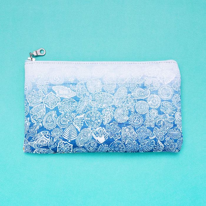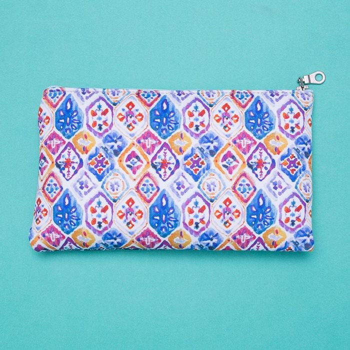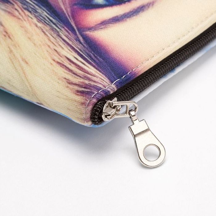 ファスナー付きの横長シルエットは写真コラージュやタイポグラフィが映えます。前面に自分の名前、背面にお気に入りの写真を配置して『オーダー メイド ポーチ』を楽しみましょう。ペット写真やシンプルなロゴも人気です。