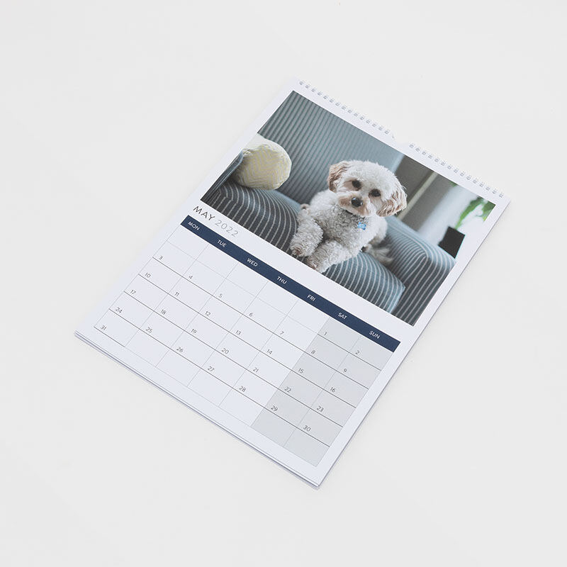 細かい線やパターン模様も高画質で印刷されるプリント技術を採用しております。フロントカバーは豪華な光沢仕上げが施されるので、カバー全体に写真1枚を印刷するのもよし、複数の写真を組み合わせたコラージュをプリントするのもきれいに仕上がります。カレンダーに文字でタイトルを挿入するオプションもご用意。フックで壁にも掛けられるようになっているホワイトのワイヤーでカレンダーを装丁しますので、月ごとにページをめくるのも簡単です。写真や画像を1枚またはコラージュデザインなどを、デザイン画面上で月ごとにデザインいただけます。お気に入りの写真や画像をアップロードできるだけでなく、1行メッセージなど文字も入れることが可能ですので、よりユニークなカレンダーとなることでしょう。厚み2.5mmの白い台紙が付きますので、壁に掛けない際は卓上に立てて使用することもできます。